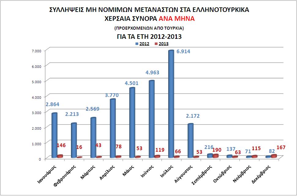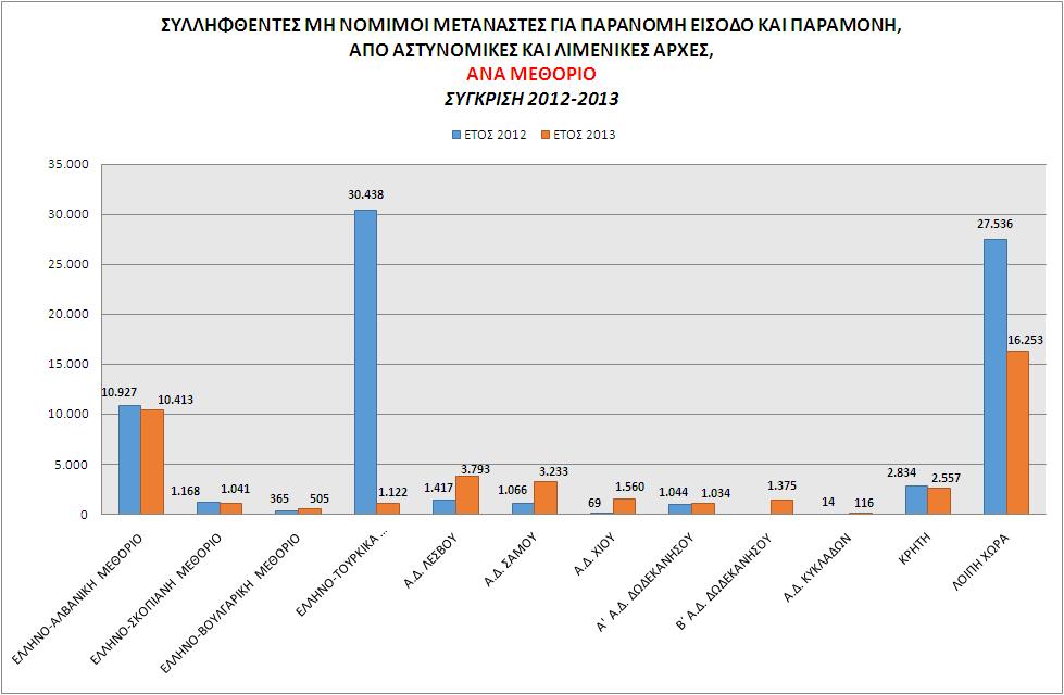 |  | Συλληφθέντες μη νόμιμοι μετανάστες, για παράνομη είσοδο & παραμονή, από Αστυνομικές και Λιμενικές Αρχές Σύγκριση 2012 - 2013