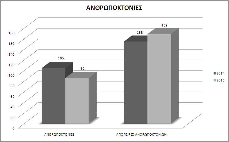 Το 2015 καταγράφηκαν σε όλη την Επικράτεια 19 λιγότερες υποθέσεις ανθρωποκτονιών (μείωση σε ποσοστό 18,1%), σε σχέση με το 2014. Συγκεκριμένα, καταγράφηκαν (86) υποθέσεις ανθρωποκτονιών, από τις οποίες οι (16) έγιναν με κίνητρο τη ληστεία, ενώ το 2014 είχαν καταγραφεί (105) από τις οποίες οι (21) με κίνητρο τη ληστεία. Επίσης διαπράχθηκαν (169) απόπειρες ανθρωποκτονίας, έναντι (155) που είχαν καταγραφεί το 2014 (14 περισσότερες), αύξηση σε ποσοστό 9,03%.