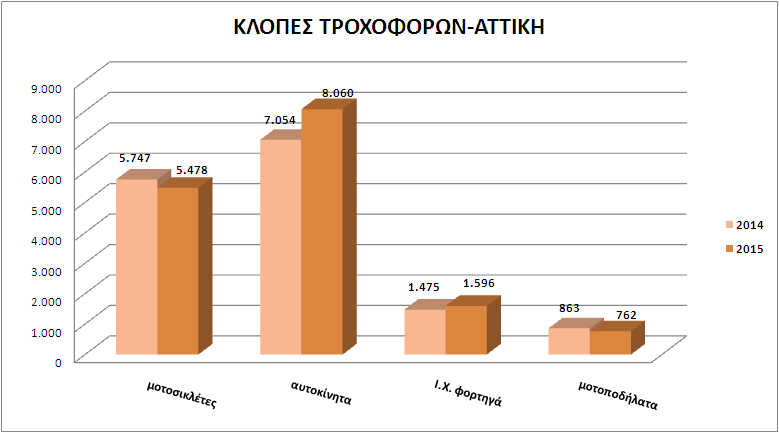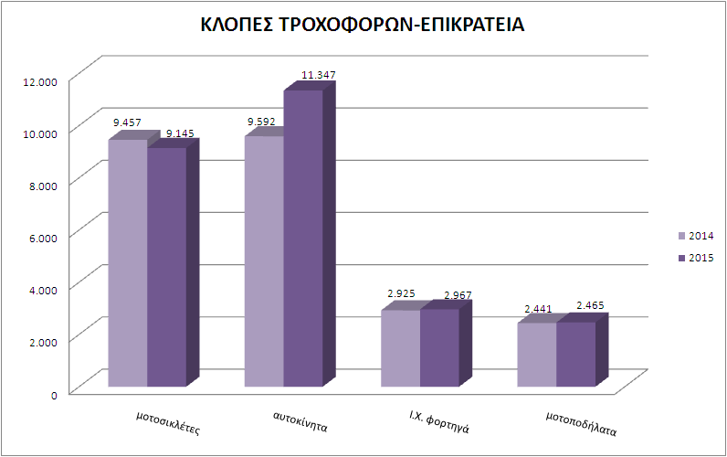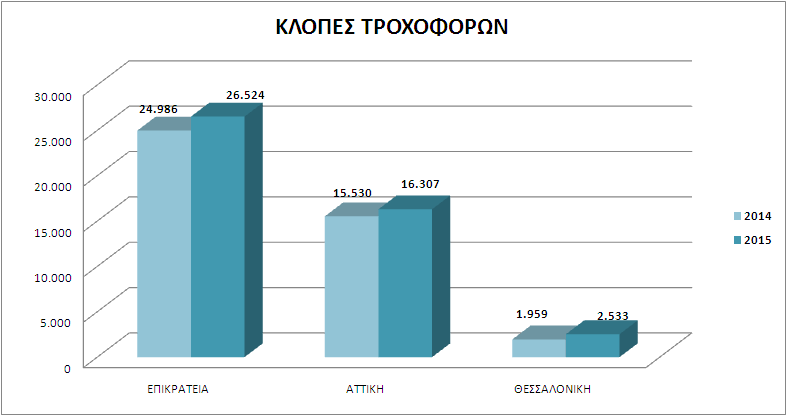 Συγκεκριμένα, σε επίπεδο επικράτειας, καθώς και στις πόλεις της Αθήνας και Θεσσαλονίκης όπου καταγράφεται ο κύριος όγκος των κλοπών και των διαρρήξεων, στη σύγκριση του έτους 2015 σε σχέση με το έτος 2014, καταγράφονται τα εξής :