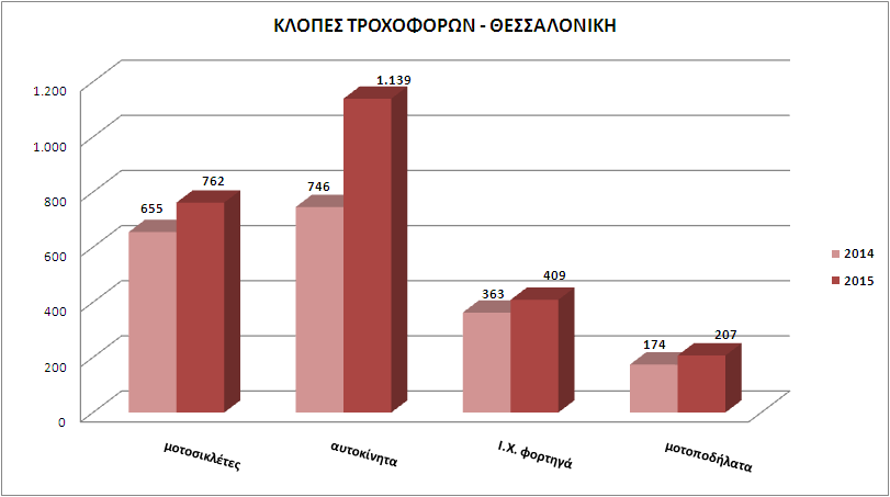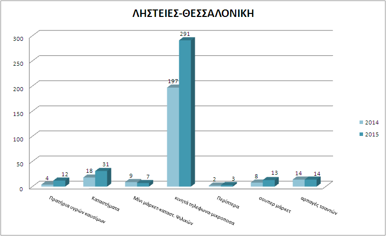 Αντίστοιχα στη Θεσσαλονίκη, στις παρακάτω κατηγορίες ληστειών καταγράφηκαν: