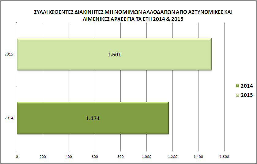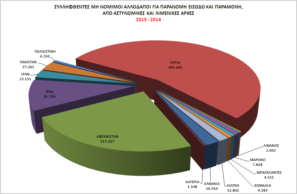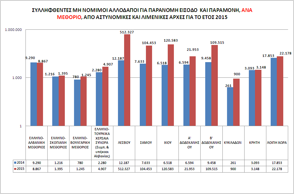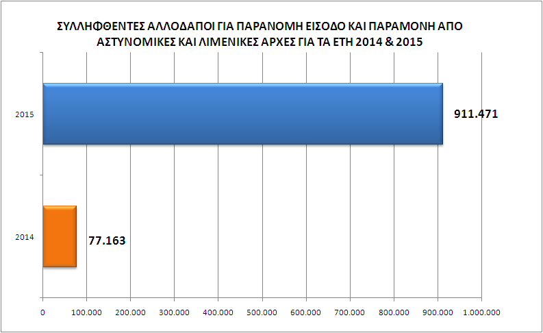 Επίσης το 2015, η χώρα μας διαχειρίστηκε έναν πολύ μεγάλο αριθμό μεταναστευτικών και προσφυγικών ροών, κυρίως μέσω των θαλασσίων συνόρων με την Τουρκία, με αποτέλεσμα να συλληφθούν από τις Αστυνομικές και τις Λιμενικές Αρχές, συνολικά (911.471) μη νόμιμοι μετανάστες.