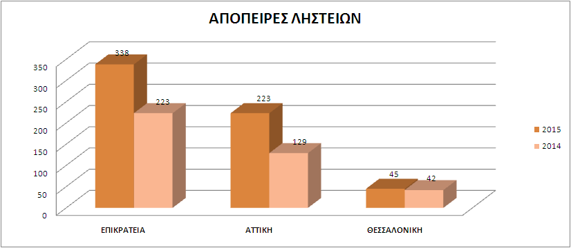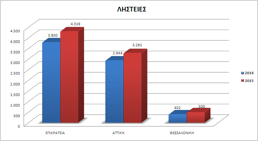 Συγκεκριμένα, σε επίπεδο Επικράτειας, καθώς και στις πόλεις της Αθήνας και Θεσσαλονίκης, όπου παρατηρείται ο κύρος όγκος των ληστειών, στη σύγκριση του 2015 με το 2014, καταγράφονται: