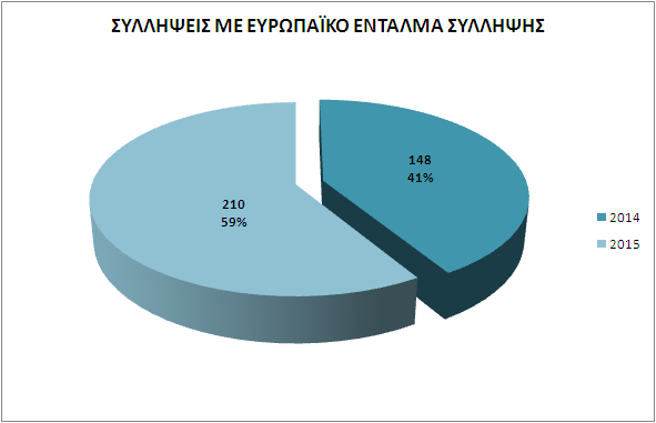 Επίσης, συνελήφθησαν το 2015 στον χώρο Schengen βάσει ελληνικών ενταλμάτων σύλληψης (96) διωκόμενα άτομα, έναντι (43) που συνελήφθησαν το 2014.