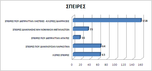 Σε αυτές συγκαταλέγονται σπείρες που διέπρατταν ληστείες σε οικίες – καταστήματα, κλοπές και διαρρήξεις σε σπίτια, οχήματα και πεζούς, καθώς και πολυμελείς εγκληματικές οργανώσεις, που διέπρατταν εγκλήματα βίας σε βάρος ιδιοκτητών καταστημάτων και άλλων επιχειρηματικών δραστηριοτήτων. Επίσης, εξαρθρώθηκαν εγκληματικές οργανώσεις που διακινούσαν μεγάλες ποσότητες ναρκωτικών ουσιών.