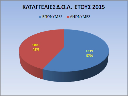 Επισημαίνεται ότι, κατά τη διάρκεια του έτους 2015, η Διεύθυνση Οικονομικής Αστυνομίας δέχθηκε συνολικά 2.324 καταγγελίες για αδικήματα αρμοδιότητάς της. Οι καταγγελίες αυτές ομαδοποιούνται, κατά γεωγραφική περιοχή και είδος παράνομης δραστηριότητας, εξετάζονται από επιτροπές αξιολόγησης και προωθούνται στα Τμήματα της Οικονομικής Αστυνομίας για περαιτέρω αστυνομική έρευνα. Από το σύνολο των καταγγελιών, οι 1.319 καταγγελίες έγιναν επώνυμα, ενώ οι 1.005 ανώνυμα.