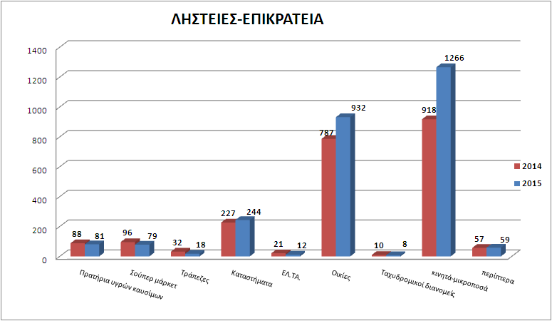 Ειδικότερα, σε σύγκριση με το 2014, καταγράφονται λιγότερες ληστείες σε Τράπεζες, ΕΛ.ΤΑ., πρακτορεία Ο.Π.Α.Π., Σούπερ Μάρκετ, πρατήρια υγρών καυσίμων, ενώ καταγράφονται περισσότερες αρπαγές τσαντών, ληστείες για κινητά τηλέφωνα και μικροποσά, καθώς και σε οικίες, καταστήματα, μίνι μάρκετ. Στις κλοπές – διαρρήξεις στην Επικράτεια καταγράφεται αύξηση σε ποσοστό περίπου 7%.