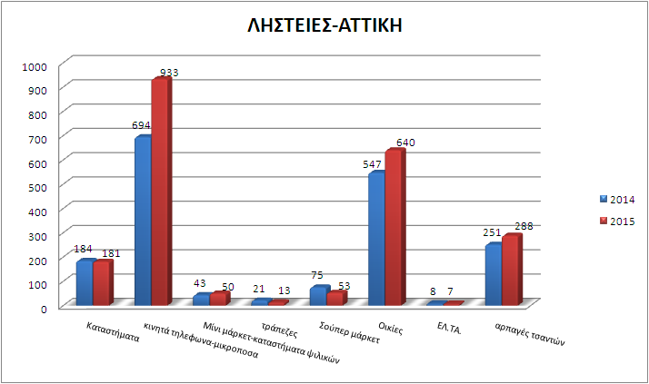 Ειδικότερα, σε σύγκριση με το 2014, καταγράφονται λιγότερες ληστείες σε Τράπεζες, ΕΛ.ΤΑ., πρακτορεία Ο.Π.Α.Π., Σούπερ Μάρκετ, πρατήρια υγρών καυσίμων, ενώ καταγράφονται περισσότερες αρπαγές τσαντών, ληστείες για κινητά τηλέφωνα και μικροποσά, καθώς και σε οικίες, καταστήματα, μίνι μάρκετ