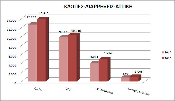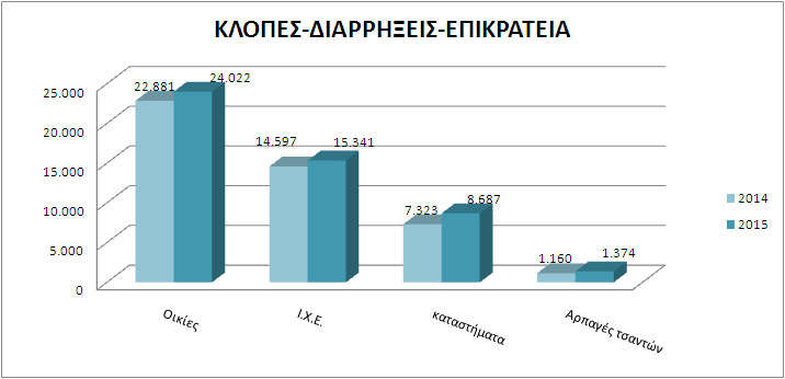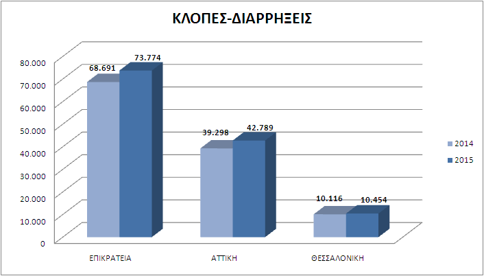 Το 2015 διαπράχθηκαν σε όλη την Επικράτεια (73.774) κλοπές – διαρρήξεις, δηλαδή (5.083) περισσότερες σε σχέση με το 2014 (68.691). Επίσης, διαπράχθηκαν (5.326) απόπειρες κλοπών-διαρρήξεων, δηλαδή (817) περισσότερες σε σύγκριση με τις (4.509) που είχαν καταγραφεί το 2014.