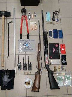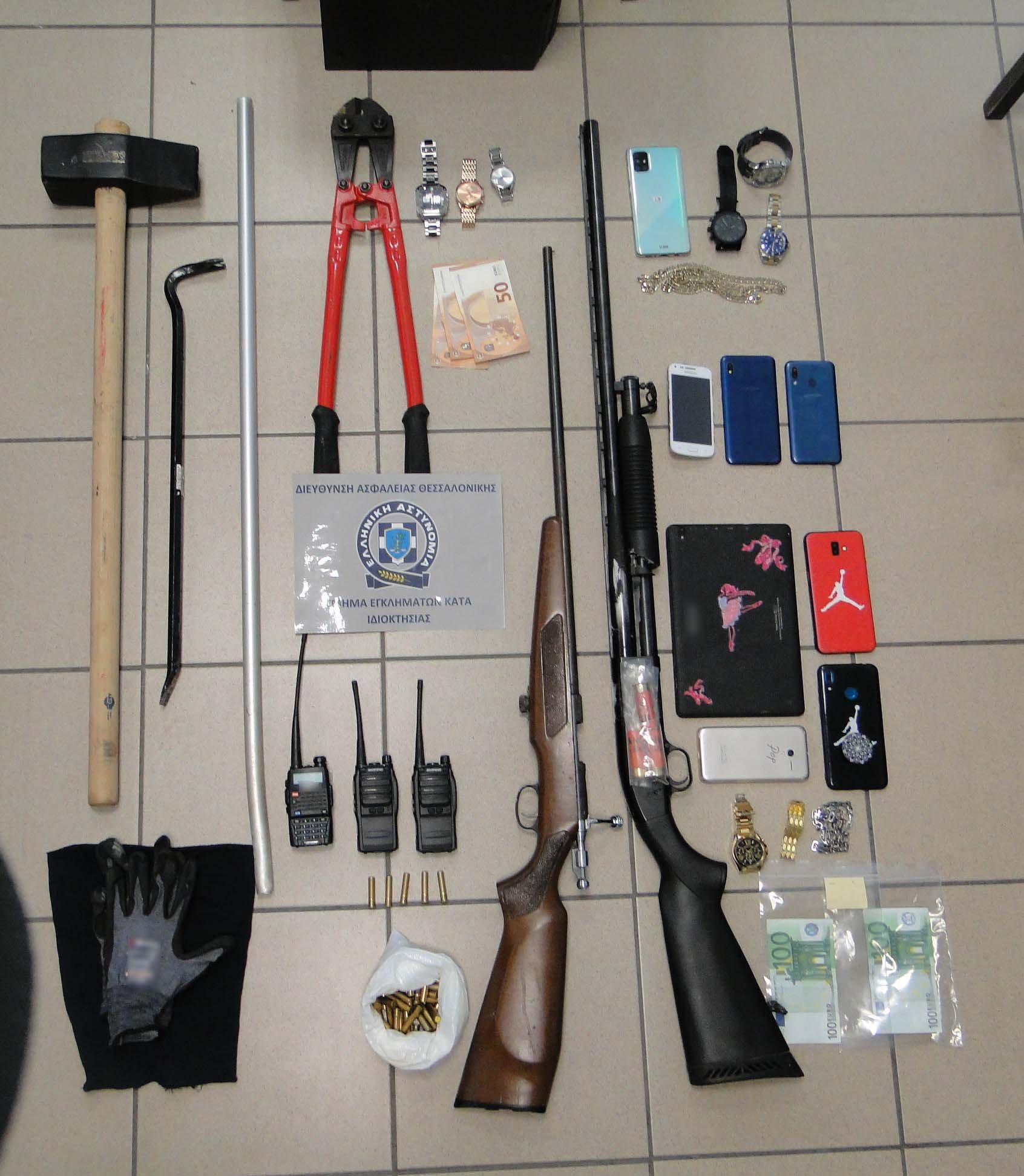 Κατά τη διάρκεια ερευνών που διενεργήθηκαν, στο πλαίσιο της αστυνομικής επιχείρησης, σε οικίες των συλληφθέντων, στις περιοχές του Λαγκαδά, Υψωμάτων Διαβατών και Κορδελιού, βρέθηκαν και κατασχέθηκαν, μεταξύ άλλων, μία (1) επαναληπτική καραμπίνα, ένα (1) κυνηγετικό όπλο, τέσσερις (4) φορητοί ασύρματοι συντονισμένοι σε συχνότητες της αστυνομίας, διαρρηκτικά εργαλεία, πλήθος κοσμημάτων κ.α..