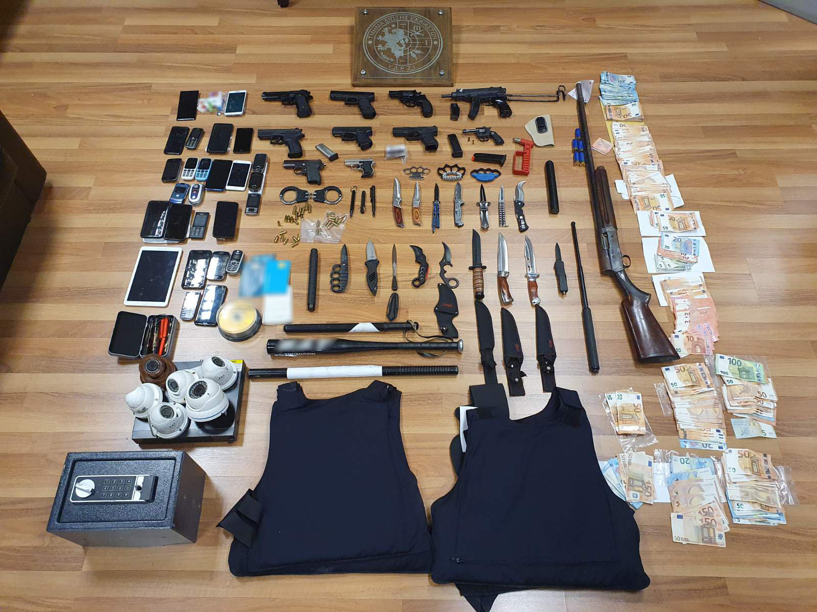 Πραγματοποιήθηκαν (14) έρευνες σε οικίες στις οποίες βρέθηκαν και κατασχεθήκαν (6) πιστόλια, (2) περίστροφα, υποπολυβόλο, πλήθος φυσιγγίων και μαχαιριών, (2) αλεξίσφαιρα, αναβολικά σκευάσματα, (3) αυτοκίνητα, (3) μοτοσικλέτες και (19.910) ευρώ