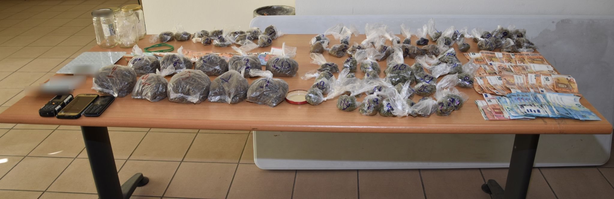Κατασχέθηκαν, μεταξύ άλλων, περισσότερα από 1.300 γραμμάρια κατεργασμένης και ακατέργαστης κάνναβης, ηλεκτρονική ζυγαριά ακριβείας και το χρηματικό ποσό των 5.210 ευρώ
