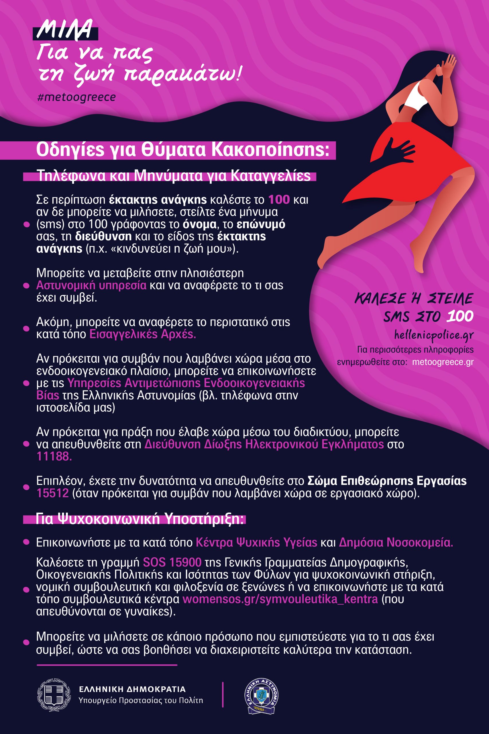 Καλέσετε τη γραμμή SOS 15900 της Γενικής Γραμματείας Δημογραφικής, Οικογενειακής Πολιτικής και Ισότητας των Φύλων για ψυχοκοινωνική στήριξη, νομική συμβουλευτική και φιλοξενία σε ξενώνες ή να επικοινωνήστε με τα κατά τόπο συμβουλευτικά κέντρα https://womensos.gr/symvouleutika_kentra_ota-2/ (που απευθύνονται σε γυναίκες)