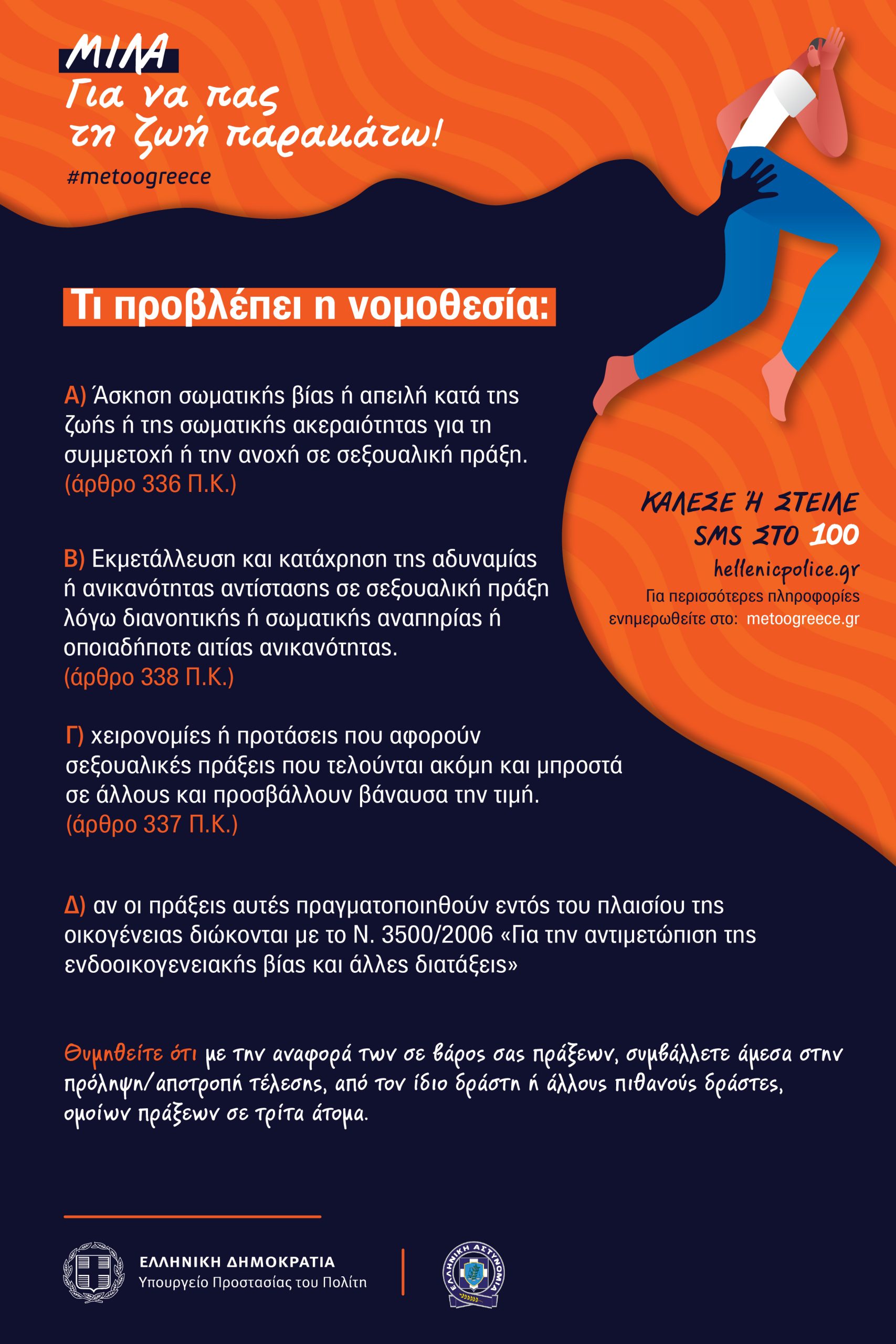 Σημειώνεται ότι για τα αδίκημα κατά της γενετήσιας αξιοπρέπειας/ελευθερίας, από τη στιγμή που θα λάβουν γνώση οι αστυνομικές αρχές θα επιληφθούν άμεσα, με ευαισθησία και σεβασμό στην προσωπικότητα και την αξιοπρέπεια του θύματος.