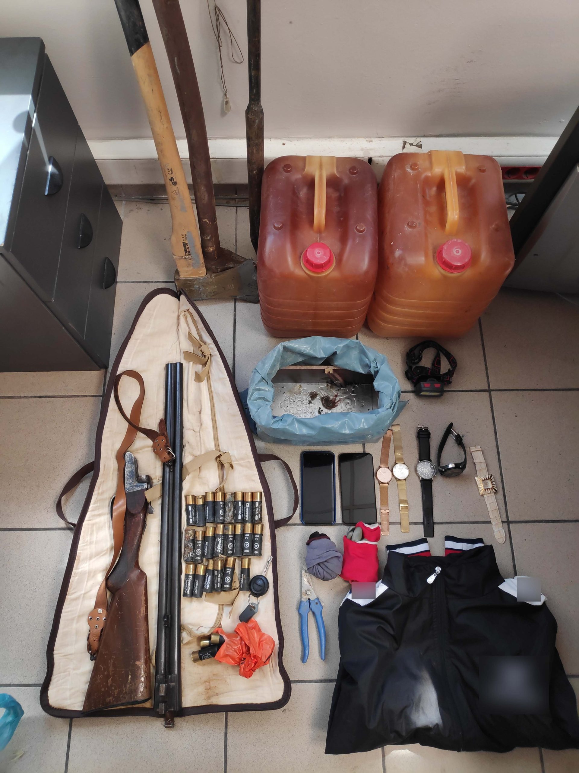 Σε έρευνες που πραγματοποιήθηκαν στις οικίες των συλληφθέντων, βρέθηκαν και κατασχέθηκαν χρηματικό ποσό, κινητά τηλέφωνα, κοσμήματα η νομιμότητα κατοχής των οποίων ερευνάται και φυσίγγια που κατείχαν παράνομα. Κατασχέθηκαν επίσης διαρρηκτικά εργαλεία και κυνηγετικό δίκαννο που είχαν αφαιρέσει στο πλαίσιο της δράσης τους.