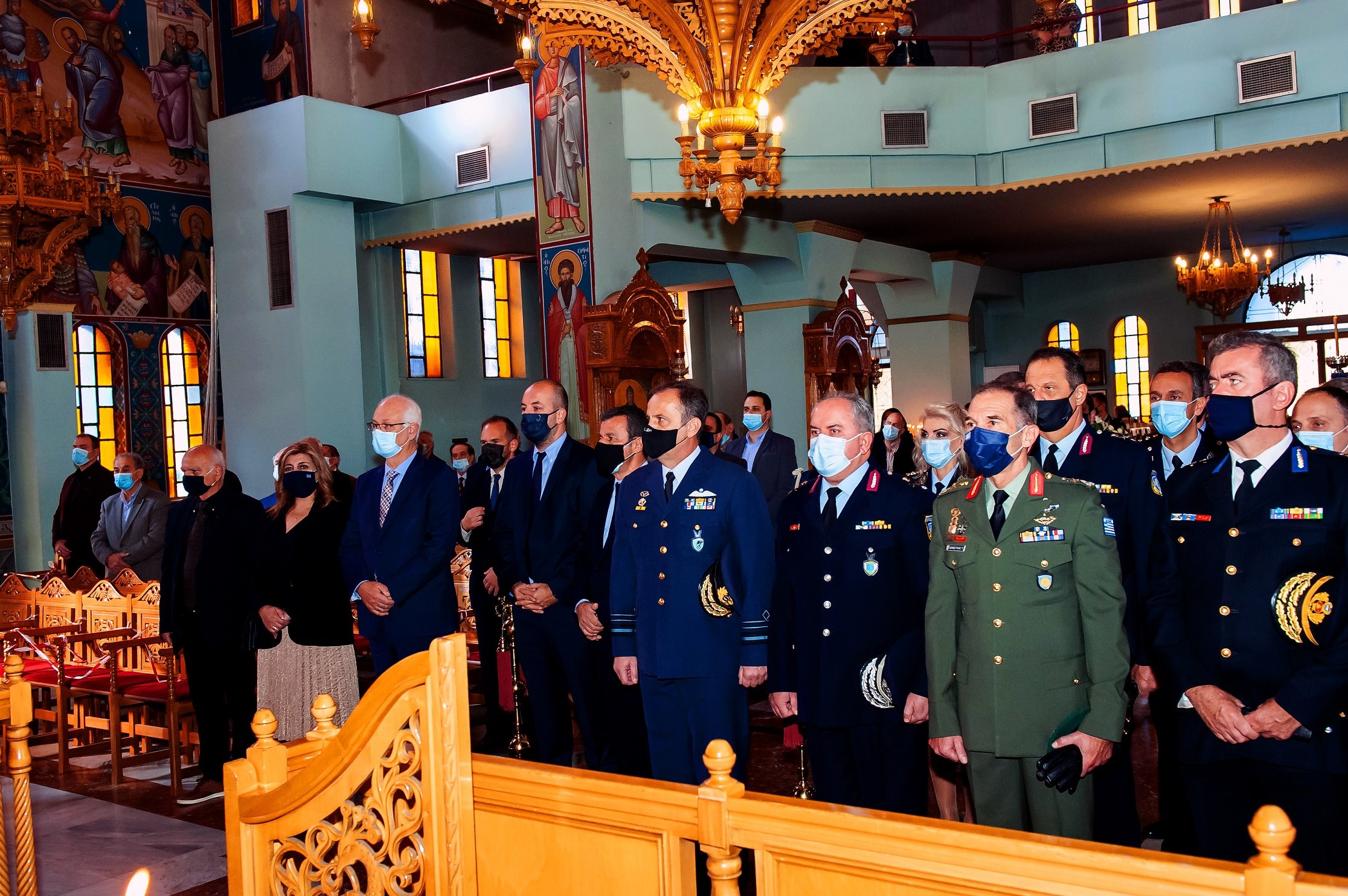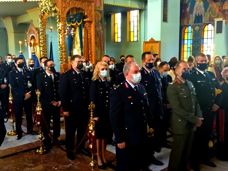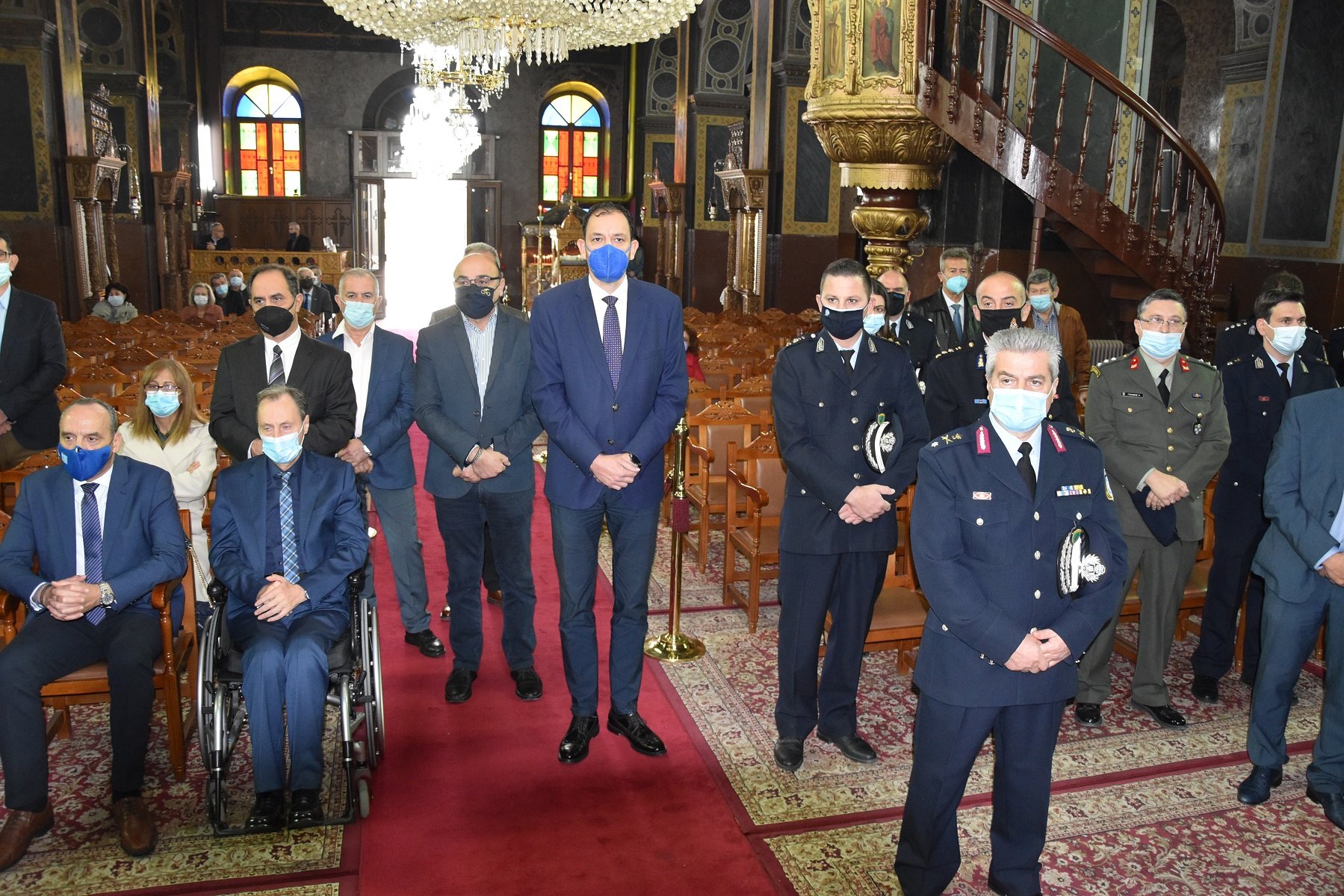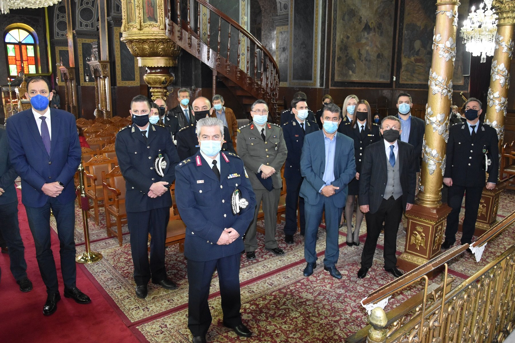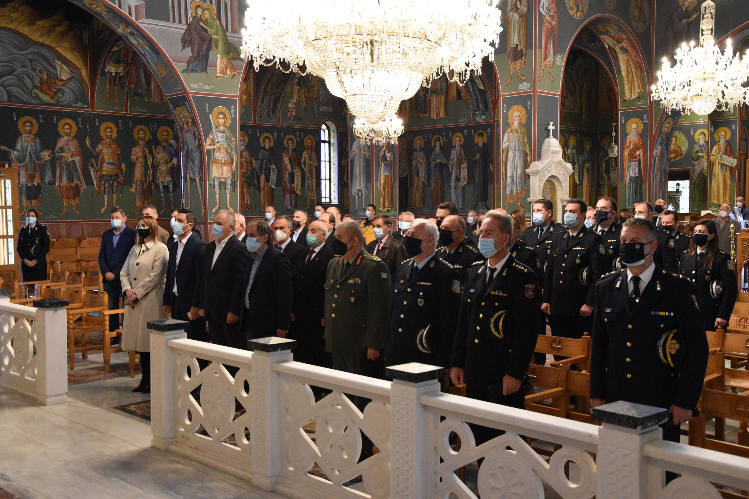 Ø στα Τρίκαλα, χοροστάτησε ο Σεβασμιότατος Μητροπολίτης Τρίκκης, Γαρδικίου και Πύλης, κ.κ. Χρυσόστομος, ενώ παρέστησαν ο Θεματικός Αντιπεριφερειάρχης Περιβάλλοντος, Χωρικού Σχεδιασμού και Πολιτικής Γης, Κωνσταντίνος Μπάρδας, ο Αντιδήμαρχος του Δήμου Τρικκαίων, Γεώργιος Ζιώγας, ο Διοικητής της Σχολής Μονίμων Υπαξιωματικών (Σ.Μ.Υ.), Ταξίαρχος Κωνσταντίνος Δαλάκης, ο Διοικητής της Πυροσβεστικής Υπηρεσίας Τρικάλων, Πύραρχος Δημήτριος Γαλάνης, ο Πρόεδρος της Ένωσης Αποστράτων νομού Τρικάλων, Ιωάννης Διαμάντης, εκπρόσωποι της Ένωσης Αστυνομικών Υπαλλήλων Τρικάλων, ο Πρόεδρος της Εβραϊκής Κοινότητας Τρικάλων, Ιακώβ Βενουζίου, η Προϊσταμένη της Δημοτικής Αστυνομίας Τρικάλων, η Διευθύντρια της Τοπικής Μονάδας Υγείας (Τ.Ο.Μ.Υ.) Τρικάλων, καθώς και εν ενεργεία αστυνομικοί.