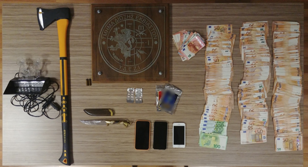 Κατασχέθηκαν τσεκούρι, μαχαίρι, -2- σφαίρες, συσκευή εκπομπής φωτεινών σημάτων, δύο συσκευασίες περιέχουσες κάνναβη μεικτού βάρους -9- γραμμ., -9- ναρκωτικά δισκία, το χρηματικό ποσό των -18.355- ευρώ και -3- κινητά τηλέφωνα