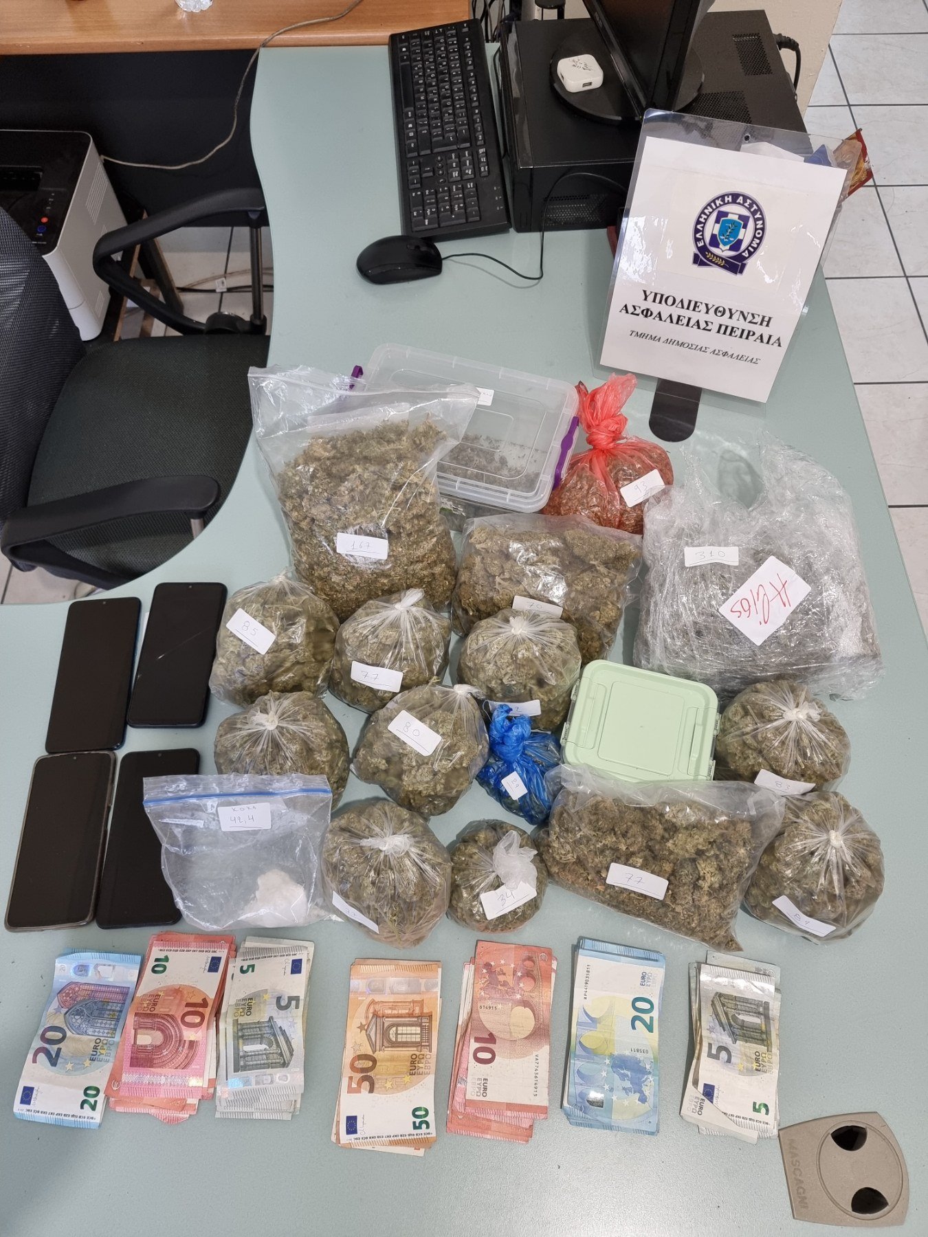 Βρέθηκαν και κατασχέθηκαν -1.470- γραμμ. ακατέργαστης κάνναβης, -42,4- γραμμ. κοκαΐνης και το χρηματικό ποσό των -1.763- ευρώ