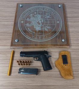 Ειδικότερα ο ανωτέρω κατελήφθη να κατέχει παράνομα πιστόλι με γεμιστήρα με 11 φυσίγγια και μεταλλική ράβδο.
