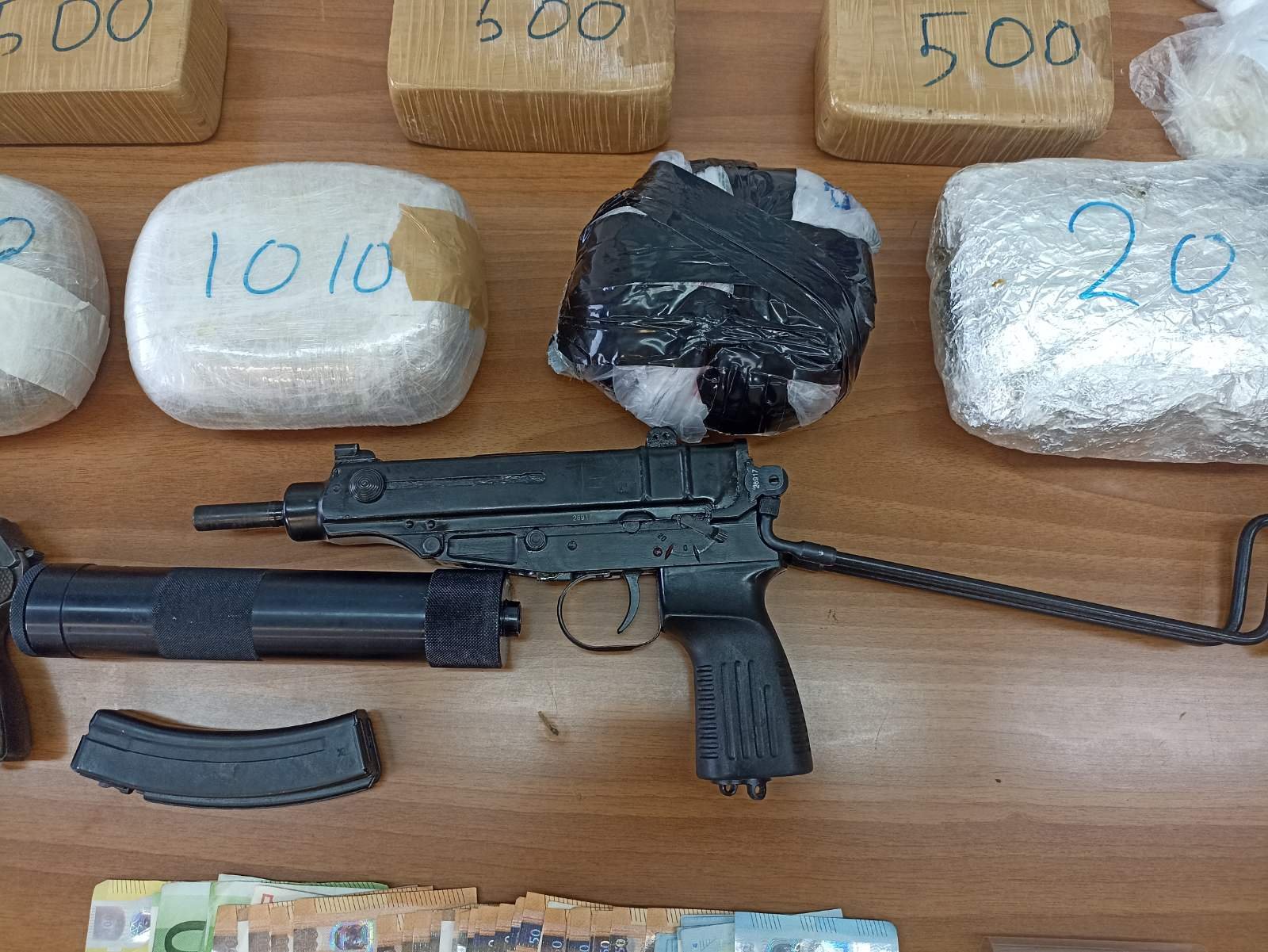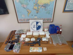 Κατασχέθηκαν -15- κιλά και -910- γραμμ. κρυσταλλικής μεθαμφεταμίνης σε υγρή μορφή, -4- κιλά και -345- γραμμ. κρυσταλλικής μεθαμφεταμίνης, -3.560,7- γραμμ. ηρωίνης, -1.610- γραμμ. ακατέργαστης κάνναβης, -3.044- γραμμ. οπίου, -0,9- γραμμ. κοκαΐνης, -2.035- γραμμ. άγνωστης χημικής ουσίας σε υγρή μορφή, -3- ηλεκτρονικές ζυγαριές ακριβείας, -9- δισκία, υποπολυβόλο, πιστόλι, καραμπίνα, σιγαστήρας πιστολιού, -91- φυσίγγια διαφόρων διαμετρημάτων και το χρηματικό ποσό των -2.600- ευρώ