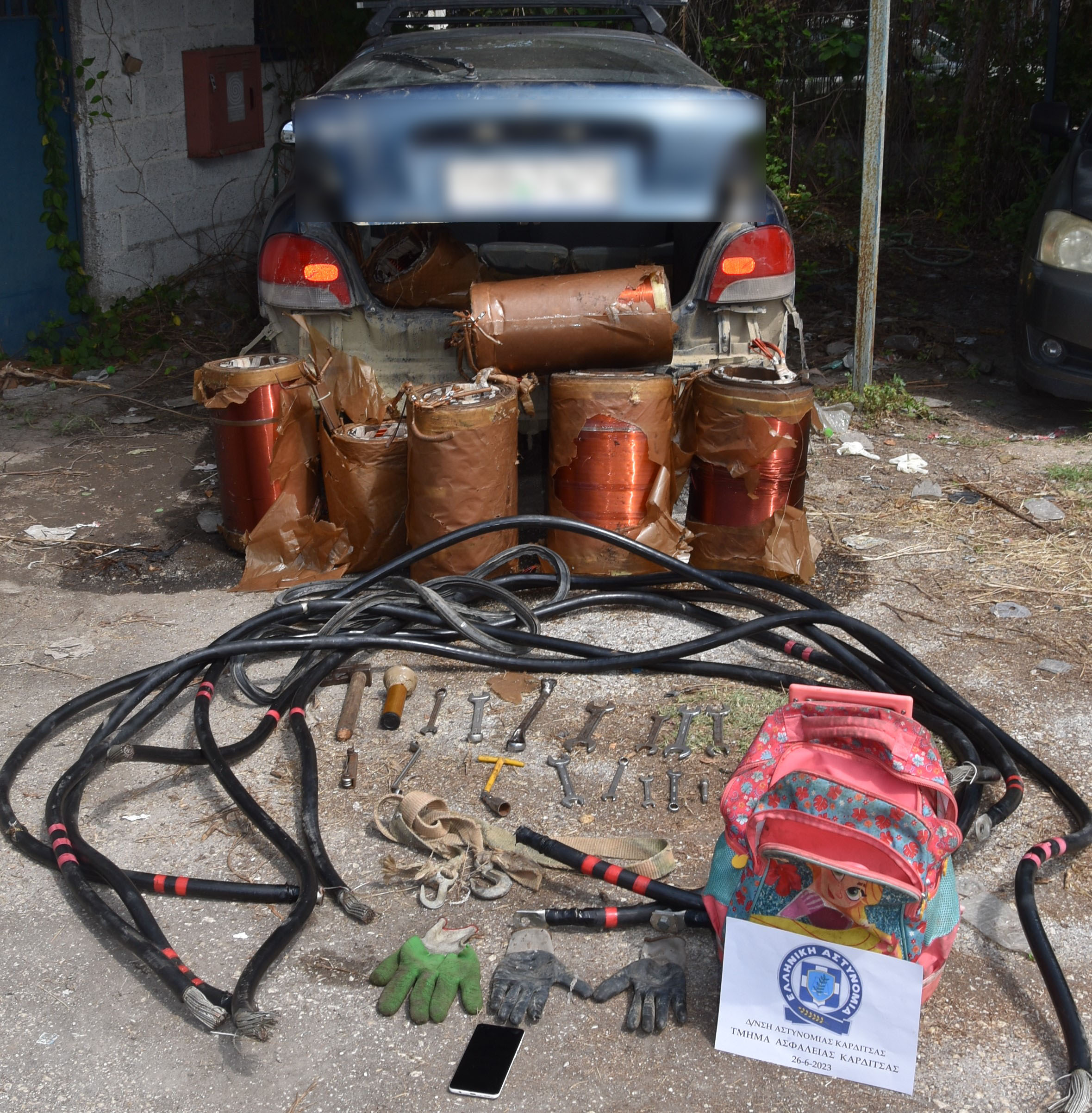 Κατασχέθηκαν, μεταξύ άλλων 7 πηνία μετασχηματιστών και 6 κομμάτια καλωδίων ΔΕΔΔΗΕ, συνολικής αξίας 35.000 ευρώ, καθώς και διαρρηκτικά εργαλεία και 2 αυτοκίνητα