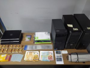 Κατασχέθηκαν, μεταξύ άλλων, πλήθος φωτοαντιγράφων ταυτοτήτων, πακέτων σύνδεσης κινητής τηλεφωνίας, τραπεζικών καρτών και -11.010- ευρώ