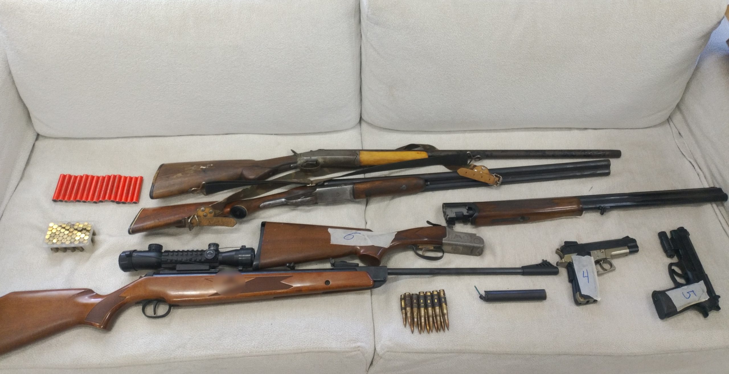Ειδικότερα, οι αστυνομικοί του Β΄Αστυνομικού Τμήματος Πατρών, πραγματοποίησαν έρευνες στις οικίες των δυο ανδρών, κατά τις οποίες βρήκαν και κατέσχεσαν τα παρακάτω, μέρος των οποίων κατείχαν παράνομα, ενώ για τα υπόλοιπα δεν πληρούνταν οι προϋποθέσεις ασφαλούς φύλαξης.
