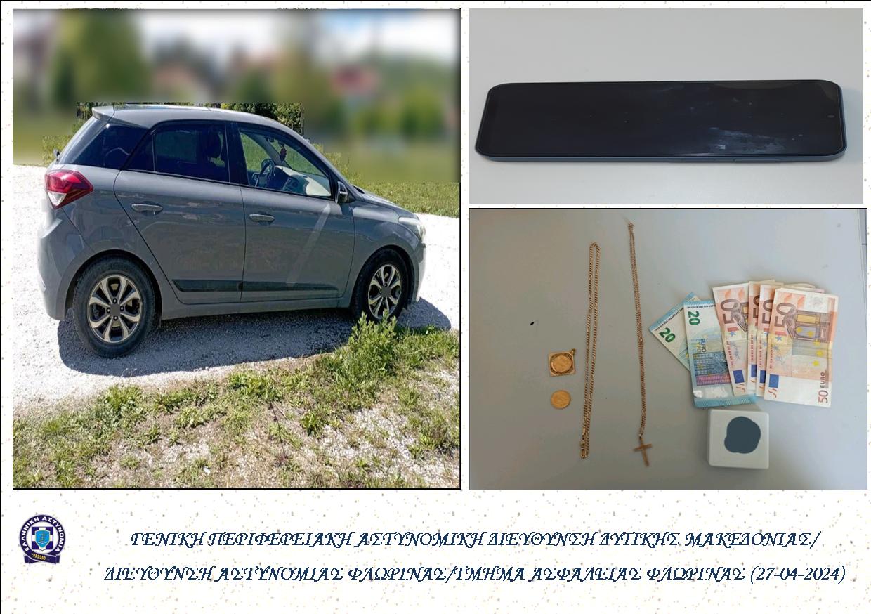 Οι ανωτέρω πολίτες αντιλαμβανόμενοι την σε βάρος τους απόπειρα εξαπάτησης ενημέρωσαν τις Αστυνομικές Αρχές. Άμεσα οργανώθηκε αστυνομική επιχείρηση, κατά την οποία αστυνομικοί του Τμήματος Ασφάλειας Φλώρινας, εντόπισαν και συνέλαβαν τον 36χρονο στην πόλη της Φλώρινας, στην κατοχή του οποίου βρέθηκαν και κατασχέθηκαν το χρηματικό ποσό των -240- ευρώ, -2- χρυσές λίρες, -2- χρυσές αλυσίδες λαιμού, -1- χρυσός σταυρός, -1- κινητό τηλέφωνο με -1- κάρτα sim, καθώς επίσης και το Ι.Χ.Ε. αυτοκίνητο στο οποίο επέβαινε.