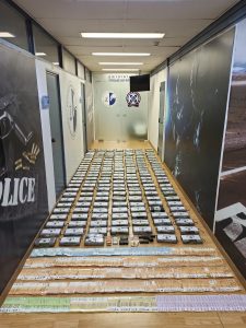 Για τον τερματισμό της δράσης τους, πραγματοποιήθηκε αστυνομική επιχείρηση πρωινές ώρες χθες, Τετάρτη 22/05/2024, κατά τη διάρκεια της οποίας εντοπίστηκε ο 48χρονος και στην κατοχή του βρέθηκαν με σκοπό την περαιτέρω διακίνηση -180- αυτοσχέδιες νάιλον συσκευασίες με περιεχόμενο κοκαΐνη, συνολικού μικτού βάρους -210- κιλών και -300- γραμμαρίων.