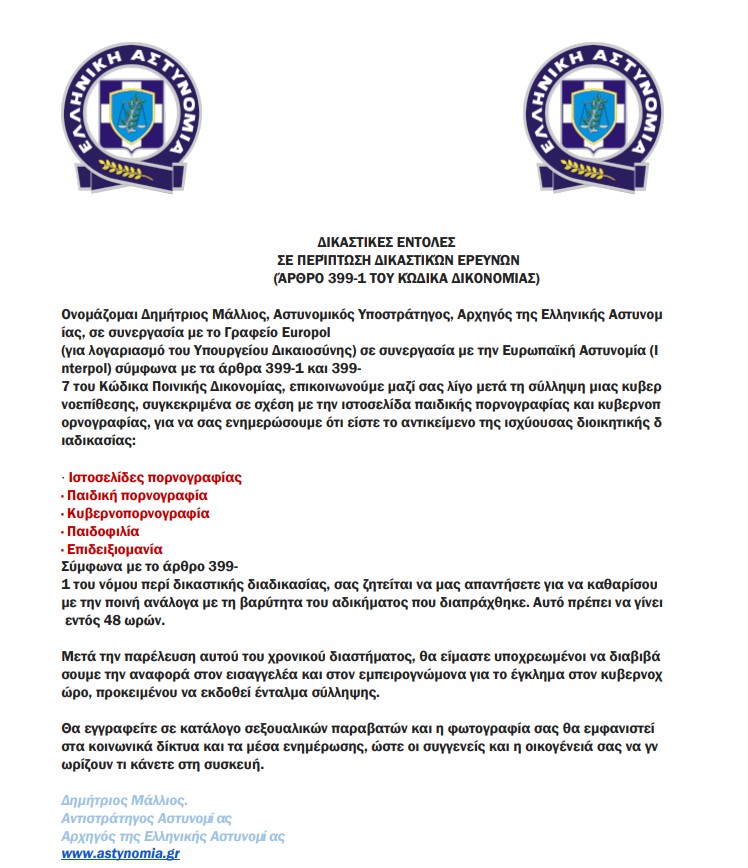 Πιο αναλυτικά, οι δράστες προσποιούμενοι τις αρμόδιες ελεγκτικές Αρχές, διακινούν επιστολή μέσω ηλεκτρονικής αλληλογραφίας και προσπαθούν να εξαπατήσουν συμπολίτες μας – χρήστες του διαδικτύου, με το πρόσχημα ότι ο αποδέκτης τους εμπλέκεται σε υπόθεση πορνογραφίας και άλλων αδικημάτων.