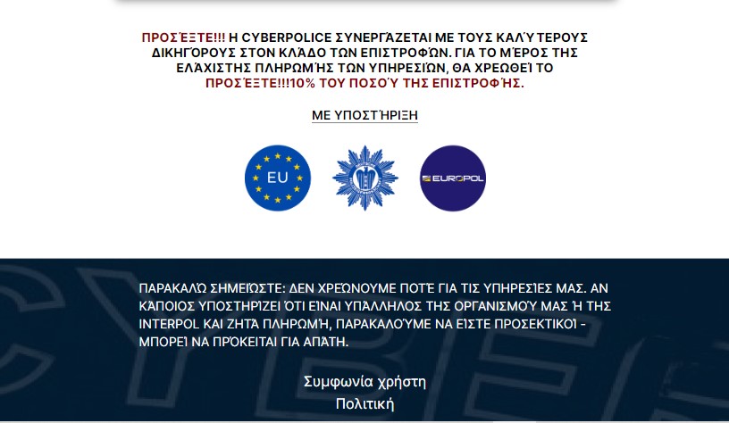 Μάλιστα, χρησιμοποιούν το λογότυπο της Ελληνικής Αστυνομίας, καθώς και άλλων επίσημων συμβόλων και Αρχών της Ευρωπαϊκής Ένωσης, στην προσπάθειά τους να προσδώσουν «αληθοφάνεια» στην απατηλή ιστοσελίδα και να δημιουργήσουν την εντύπωση ότι πρόκειται για ιστοσελίδα της Ελληνικής Αστυνομίας.