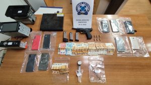 Μετά από έρευνα στην κατοχή και στις οικίες τους βρέθηκαν μεταξύ άλλων και κατασχέθηκαν πιστόλι, το οποίο όπως διαπιστώθηκε είχε κλαπεί από οικία αστυνομικού που είχαν διαρρήξει, -3- γεμιστήρες, -6- φυσίγγια, το χρηματικό ποσό των -3.085- ευρώ και -9- κινητά τηλέφωνα.
