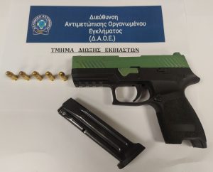 Ειδικότερα, αστυνομικοί του Τμήματος Δίωξης Εκβιαστών, εντόπισαν τον κατηγορούμενο σε καταστήματα υγειονομικού ενδιαφέροντος, σε περιοχή της Αττικής και σε έλεγχο που πραγματοποιήθηκε, βρέθηκε να κατέχει μέσα σε τσαντάκι ένα πιστόλι με γεμιστήρα που περιείχε -5- φυσίγγια, ενώ επιπλέον κατασχέθηκαν και -2- κινητά τηλέφωνα.