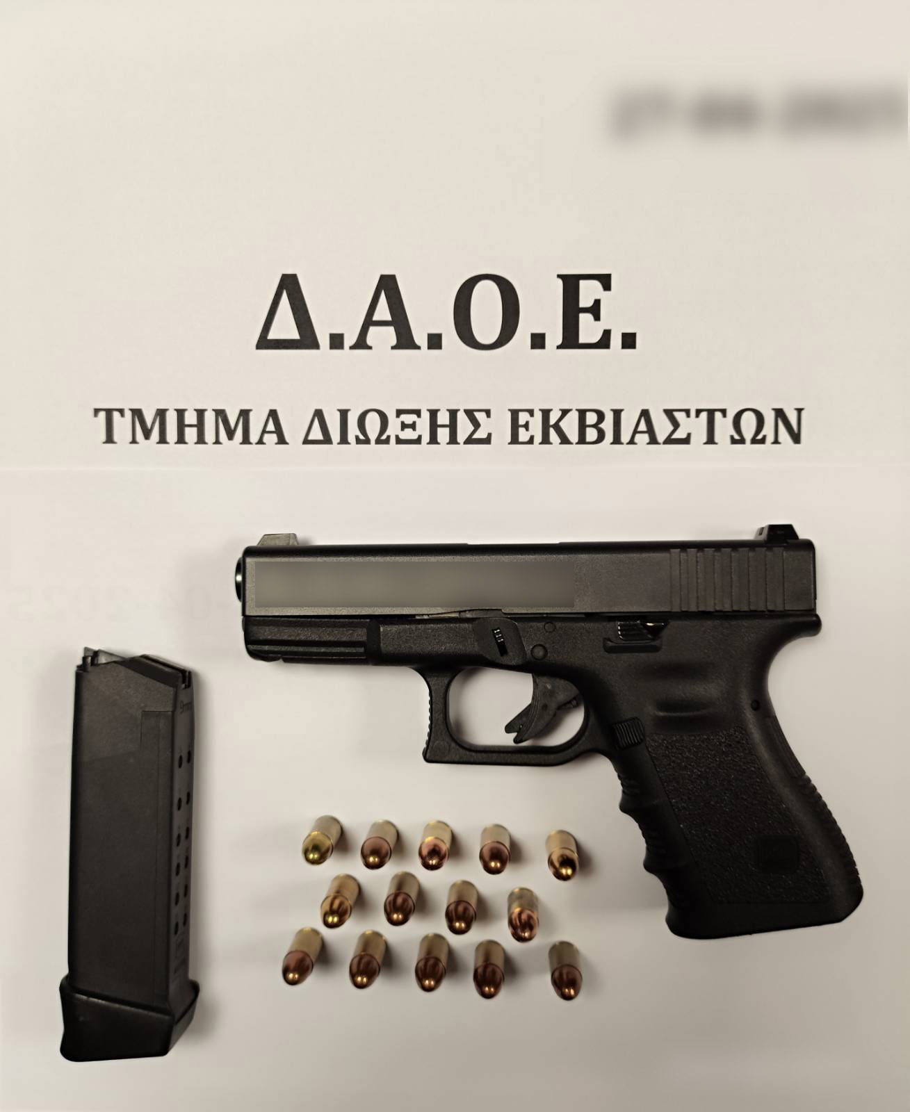 Στο πλαίσιο αυτό, εντοπίστηκε ο κατηγορούμενος, ο οποίος έφερε εντός τσάντας πιστόλι με γεμιστήρα που περιείχε -14- φυσίγγια, τα οποία κατασχέθηκαν.