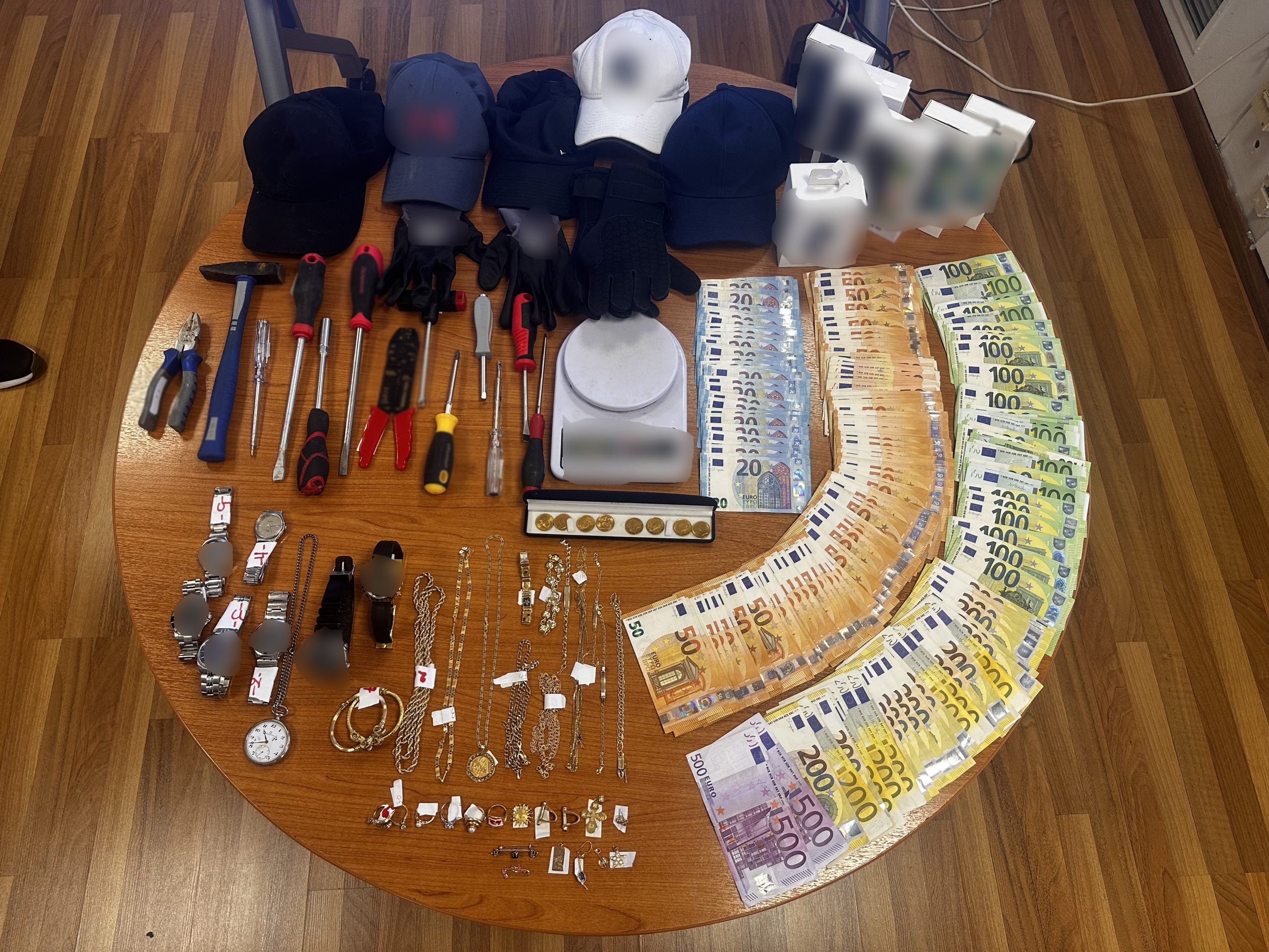 Κατασχέθηκαν, μεταξύ άλλων, πάνω από -18.000- ευρώ και -2.000- δολάρια,πλήθος κοσμημάτων, χρυσαφικών και μενταγιόν καθώς και διαρρηκτικά εργαλεία