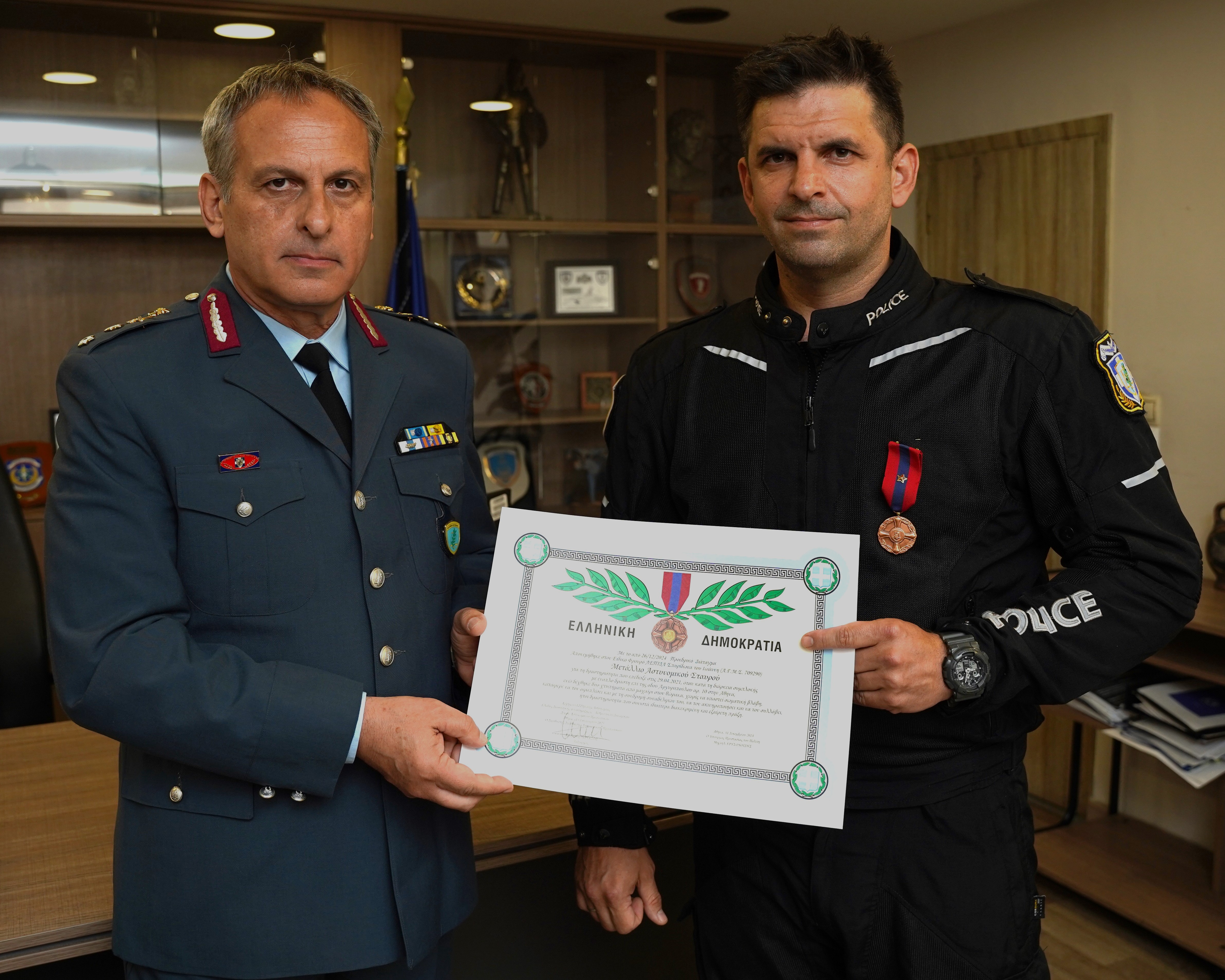 Σε ειδική τελετή που πραγματοποιήθηκε χθες, Πέμπτη 5 Ιουνίου 2025 στη Γενική Αστυνομική Διεύθυνση Αττικής, απονεμήθηκαν Αστυνομικά Μετάλλια με τα αντίστοιχα διπλώματα «Αστυνομικού Σταυρού» σε δύο αστυνομικούς της Διεύθυνσης Άμεσης Δράσης Αττικής/Ομάδα ΔΙ.ΑΣ., οι οποίοι σε κρίσιμες συνθήκες επέδειξαν θάρρος και αποφασιστικότητα, θέτοντας αποδεδειγμένα τη ζωή τους σε κίνδυνο.