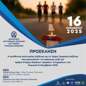Η Διεύθυνση Αστυνομίας Κοζάνης και το Τμήμα Τροχαίας Κοζάνης, με αφορμή την «Παγκόσμια Ημέρα Μνήμης για τα Θύματα Τροχαίων Ατυχημάτων», θα πραγματοποιήσουν Δρόμο Μνήμης τιμώντας τη μνήμη όσων έχασαν την ζωή τους από Τροχαία ατυχήματα, ενώ θα ακολουθήσει εκδήλωση στην Στέγη Ποντιακού Πολιτισμού στην πόλη της Κοζάνης, με τίτλο «Δρόμοι Ασφαλείς για όλους».