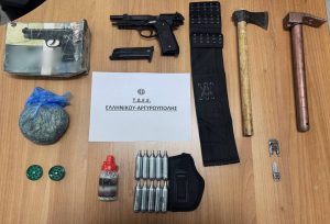 Στην κατοχή του βρέθηκαν αεροβόλο πιστόλι, τσεκούρι, σκεπάρνι, μαχαίρι-μπρελόκ, -52- γραμμ. ακατέργαστης κάνναβης και -1500- σφαίρες αεροβόλου πιστολιού