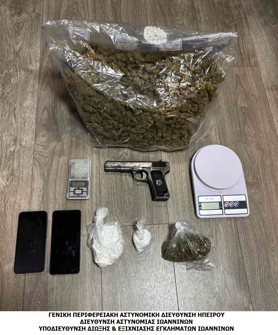 Συνελήφθη χθες (22-12-2025) το βράδυ στα Ιωάννινα από αστυνομικούς του Τμήματος Δίωξης Ναρκωτικών της Υποδιεύθυνσης Δίωξης και Εξιχνίασης Εγκλημάτων Ιωαννίνων ημεδαπός, που κατηγορείται για διακίνηση ναρκωτικών και οπλοκατοχή.