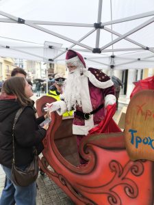 Στη δράση συμμετείχε και ο Άγιος Βασίλης του Τμήματος Τροχαίας Κοζάνης, ο οποίος μοίραζε γλυκίσματα, κεράσματα και ευχές σε διερχόμενους πολίτες
