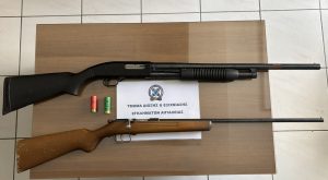 Από τη διερεύνηση της κατεύθυνσης των βολών προέκυψε ότι αυτές φέρονται να προήλθαν από οικία του κατηγορούμενου και σε έρευνες που ακολούθησαν στην οικία του βρέθηκαν και κατασχέθηκαν δύο φυσίγγια κυνηγετικού όπλου, ενώ σε περαιτέρω έρευνες που πραγματοποιήθηκαν σε επαγγελματικό του χώρο και σε αγροτική αποθήκη ιδιοκτησίας του, ο ίδιος παρέδωσε αυτοβούλως, ένα μονόκαννο κυνηγετικό όπλο και μια καραμπίνα, που κατείχε παράνομα.