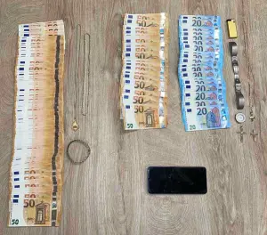 Στην κατοχή του συλληφθέντα βρέθηκαν και κατασχέθηκαν το χρηματικό ποσό των -6.600- ευρώ και διάφορα τιμαλφή, τα οποία θα αποδοθούν στις νόμιμες κατόχους τους, καθώς και -1- κινητό τηλέφωνο με -2- κάρτες sim, ως μέσο τέλεσης των αξιόποινων πράξεων.