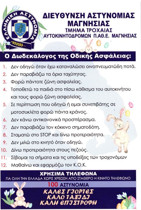 Από αστυνομικούς του Τμήματος Τροχαίας Αυτοκινητοδρόμων Π.Α.Θ.Ε. Μαγνησίας της Διεύθυνσης Αστυνομίας Μαγνησίας, διανεμήθηκαν χθες, Μ. Πέμπτη 9 Απριλίου 2026, το πρωί, ενημερωτικά φυλλάδια με συμβουλές οδικής ασφάλειας σε οδηγούς οχημάτων στο Σταθμό Διοδίων Πελασγίας.