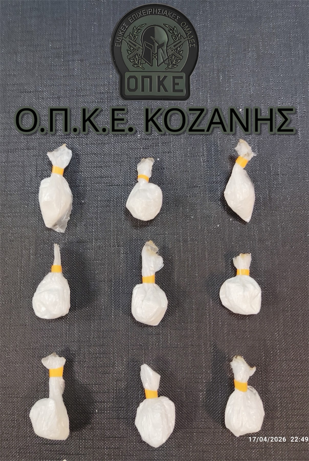 Συνελήφθη, χθες (17-04-2026) το βράδυ σε περιοχή της Κοζάνης, από αστυνομικούς της Ομάδας Πρόληψης και Καταστολής Εγκλήματος (Ο.Π.Κ.Ε.) του Τμήματος Δίωξης και Εξιχνίασης Εγκλημάτων Κοζάνης, 37χρονος ημεδαπός, για κατοχή ναρκωτικών ουσιών.
