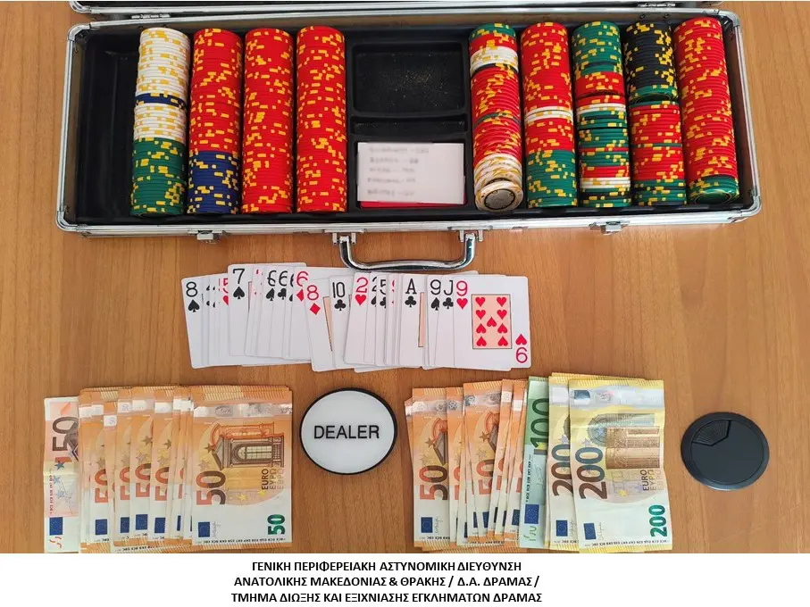 Ειδικότερα, οι αστυνομικοί πραγματοποίησαν έλεγχο σε χώρο που βρίσκεται στην πόλη της Δράμας, κατά τη διάρκεια του οποίου διαπιστώθηκε η διεξαγωγή παράνομου τυχερού παιγνίου «POKER», όπου συμμετείχαν ένας από τους συλληφθέντες ως «Dealer», τέσσερις ως παίκτες και ένας που παρείχε βοηθητικές υπηρεσίες στους παίκτες.