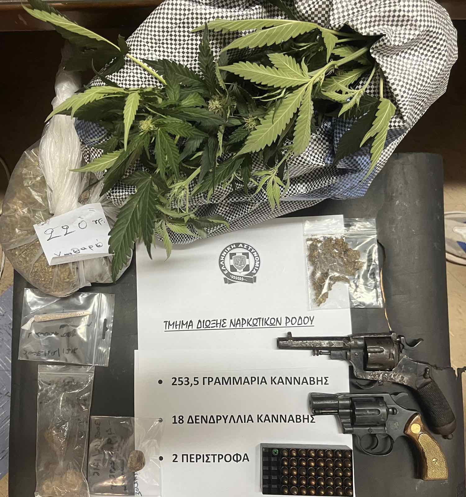 Κατασχέθηκαν -18- δενδρύλλια κάνναβης, -225- γραμμ. κατεργασμένης κάνναβης, -29-γραμμ. ακατέργαστης κάνναβης, -2- περίστροφα κ.α.