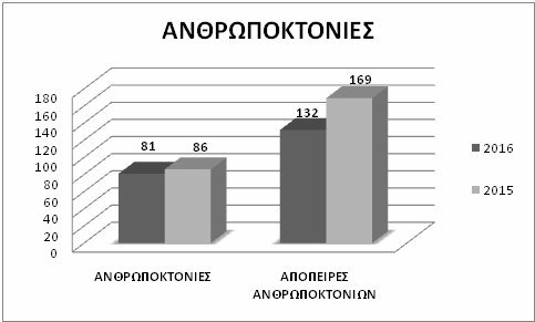 Το 2016 καταγράφηκαν σε όλη την επικράτεια (5) λιγότερες υποθέσεις ανθρωποκτονιών σε σχέση με το 2015. Συγκεκριμένα, καταγράφηκαν (81) υποθέσεις ανθρωποκτονιών, από τις οποίες οι (9) έγιναν με κίνητρο τη ληστεία, ενώ το 2015 είχαν καταγραφεί (86) από τις οποίες οι (17) με κίνητρο τη ληστεία. Επίσης διαπράχθηκαν (132) απόπειρες ανθρωποκτονίας, έναντι (169) που είχαν καταγραφεί το 2015. (37 λιγότερες, μείωση σε ποσοστό 21,9%).