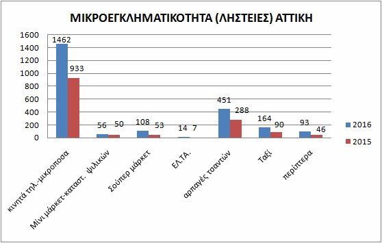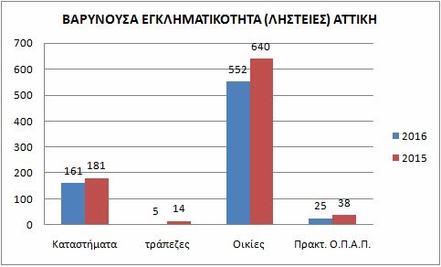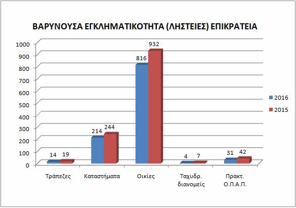 Ειδικότερα, σε σύγκριση με το 2015, καταγράφονται λιγότερες ληστείες σε οικίες, σε καταστήματα, τράπεζες, πρακτορεία Ο.Π.Α.Π., ταχυδρομικούς διανομείς, ενώ καταγράφονται περισσότερες αρπαγές τσαντών, ληστείες για κινητά τηλέφωνα και μικροποσά, σε μίνι μάρκετ, σε περίπτερα και σε πρατήρια υγρών καυσίμων