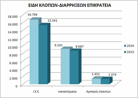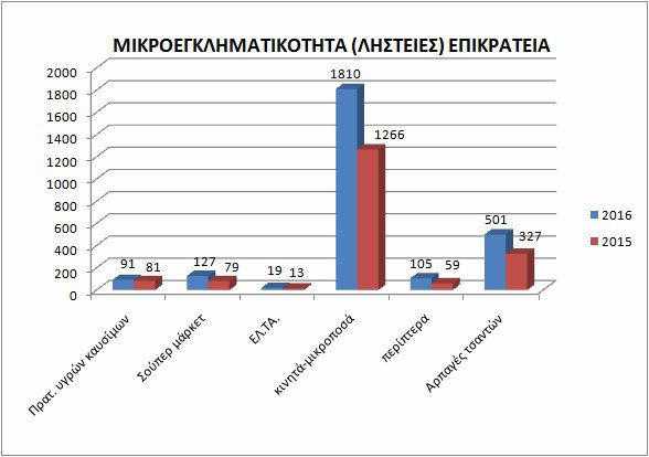 Ειδικότερα, το έτος 2016 σε σύγκριση με το 2015, καταγράφονται λιγότερες ληστείες σε οικίες, σε καταστήματα, τράπεζες, πρακτορεία Ο.Π.Α.Π., σε ταχυδρομικούς διανομείς, ενώ καταγράφονται περισσότερες αρπαγές τσαντών, ληστείες για κινητά τηλέφωνα και μικροποσά, σε σούπερ μάρκετ, σε μίνι μάρκετ, σε περίπτερα και σε πρατήρια υγρών καυσίμων.