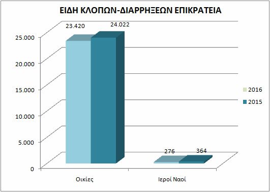 Συμπερασματικά το έτος 2016 παρατηρείται μετατόπιση στους λεγόμενους «εύκολους στόχους» ή στόχους «χαμηλού ρίσκου», καθώς οι ληστείες και κλοπές – διαρρήξεις σε στόχους «υψηλού ρίσκου» έχουν μειωθεί αισθητά.