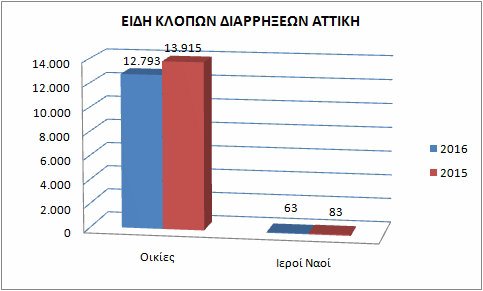 Συνολικά, το 2016 διαπράχθηκαν στην επικράτεια 75.083 κλοπές-διαρρήξεις, από τις οποίες 43.270 στην Αττική και 11.822 στη Θεσσαλονίκη.